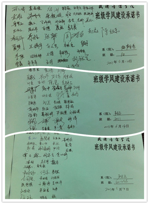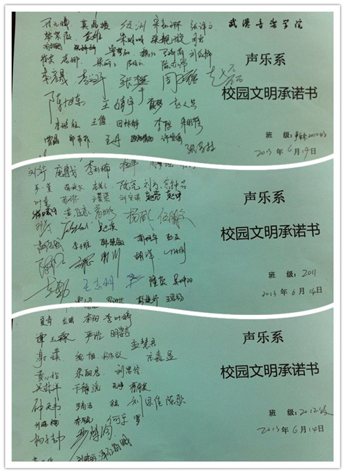 随后,曾苗老师宣读了“声乐系班级学风建设承诺书”和“声乐系校园文明承诺书”,倡议全体同学秉承“立德、自强、崇文、精艺”的校训,端正学习态度,严守校纪校规,做一名品学兼优的大学生。全体同学在会后签署了承诺书。